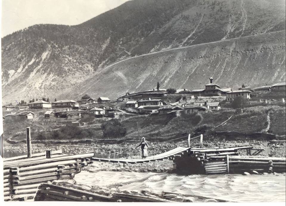 Балкарское село Эль-Тюбю (Верхнечегемское). На переднем плане мост. Опоры каменные, пролет перекрыт бревнами. Деревянное полотно моста покрыто землей.